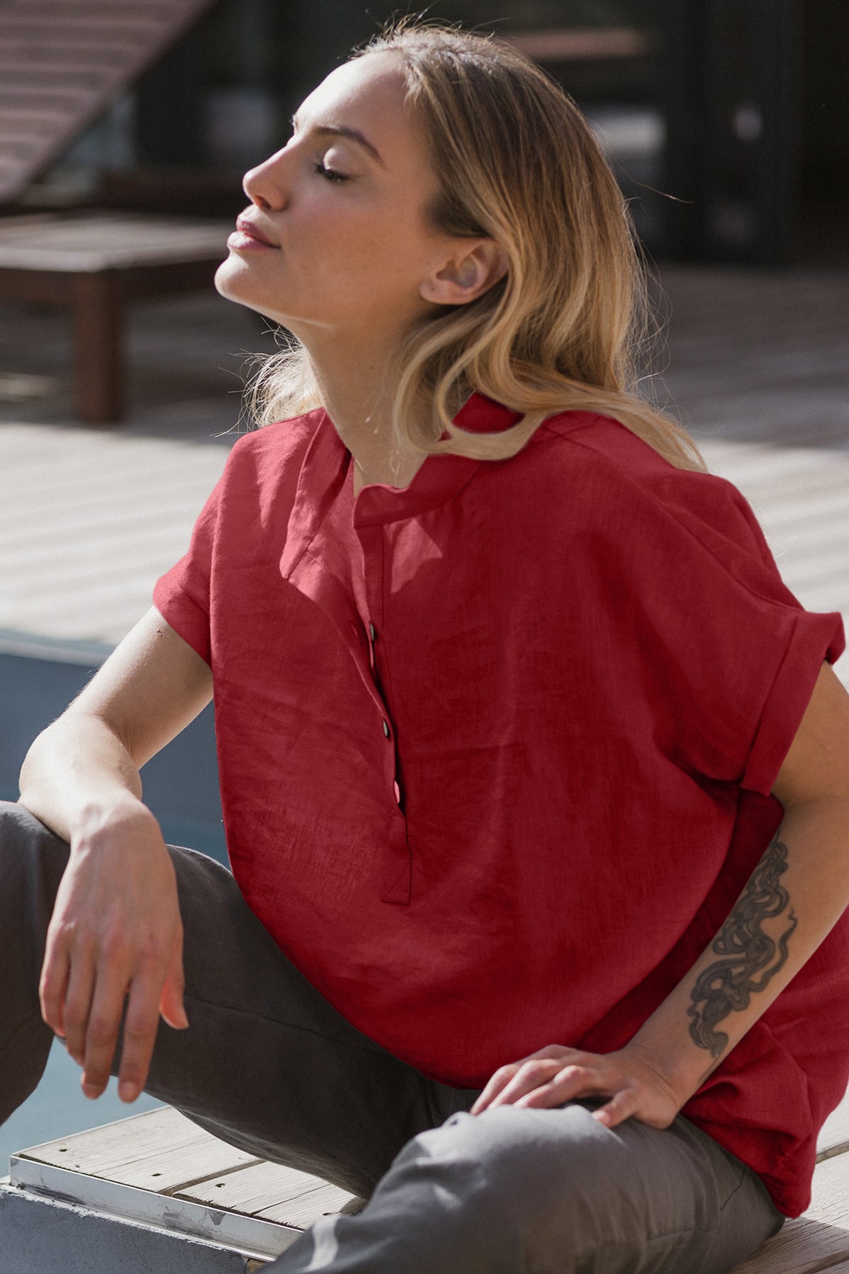Blusa de mujer de manga corta en lino burdeos - Flor