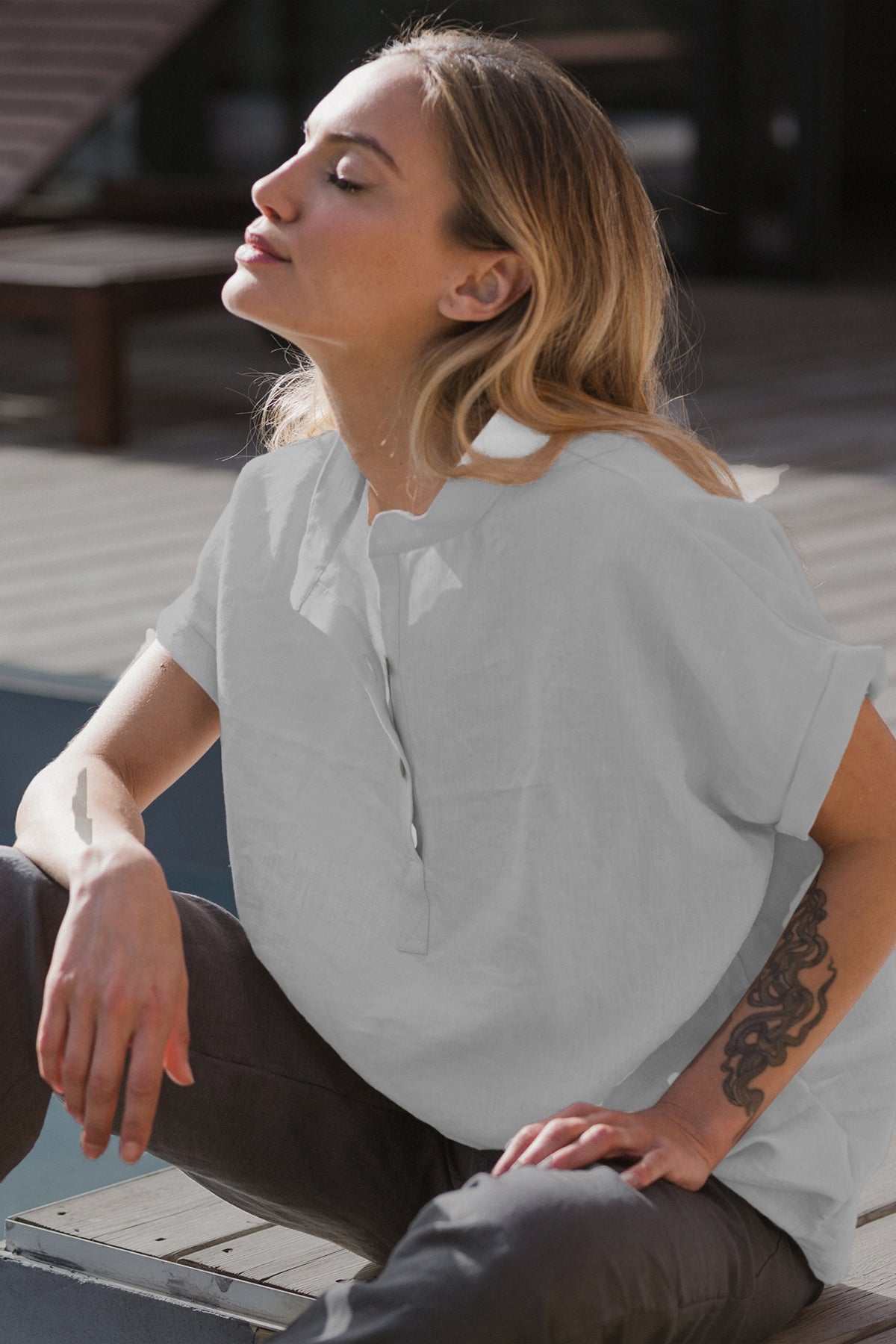 Blusa de mujer de manga corta en lino gris mineral - Flor