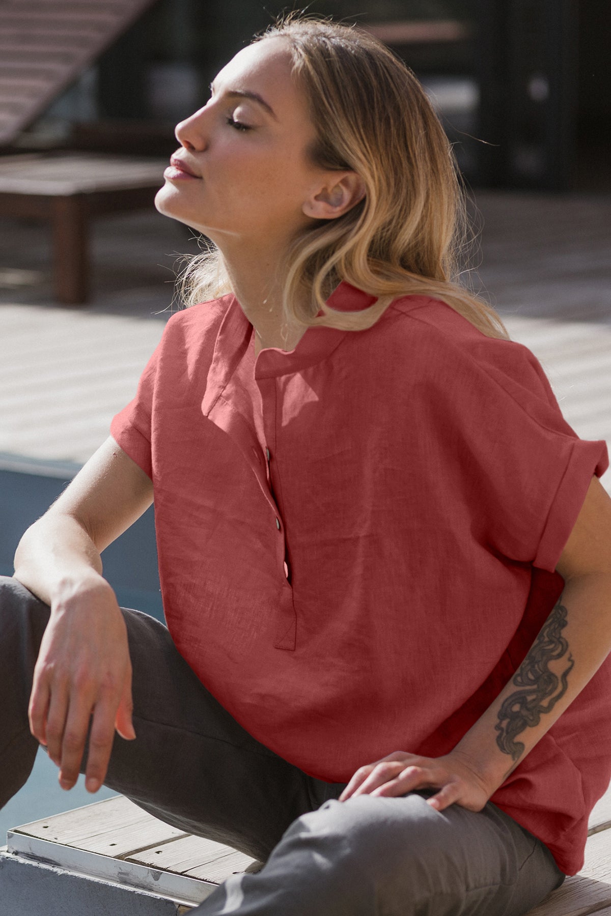 Blusa de mujer de manga corta en lino rojo ladrillo - Flor