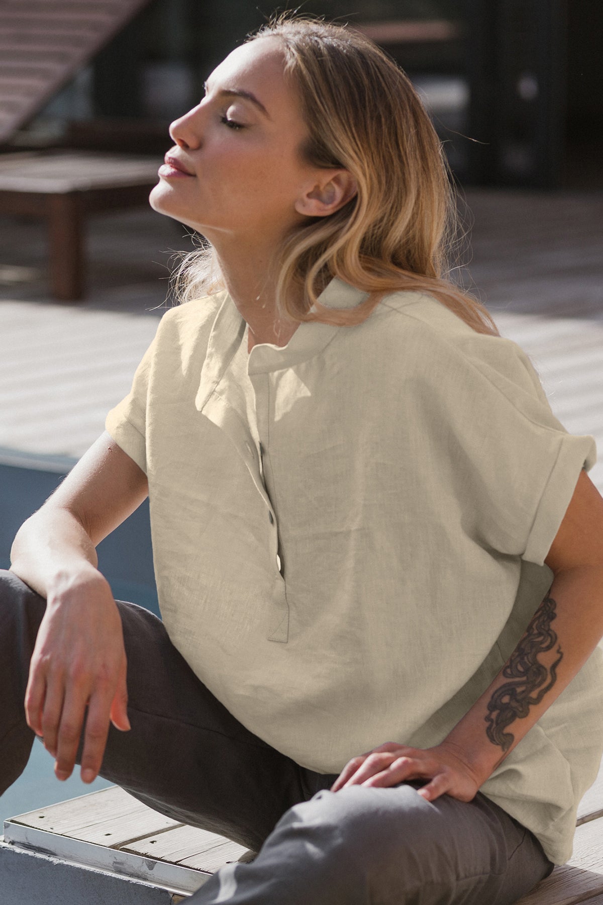 Blusa de mujer con mangas cortas en lino beige natural - Flor