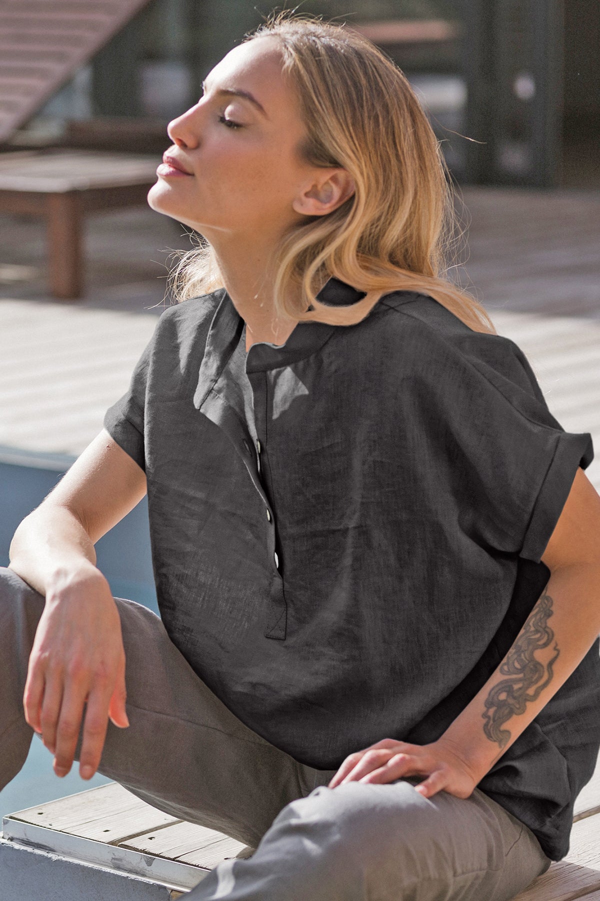 Blusa de mujer de manga corta en lino negro tinta - Flor