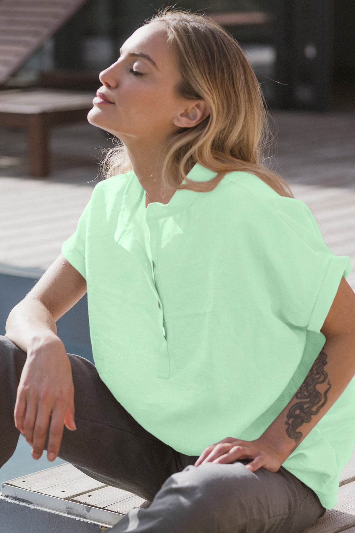 Blusa de mujer de manga corta en lino verde menta - Flor
