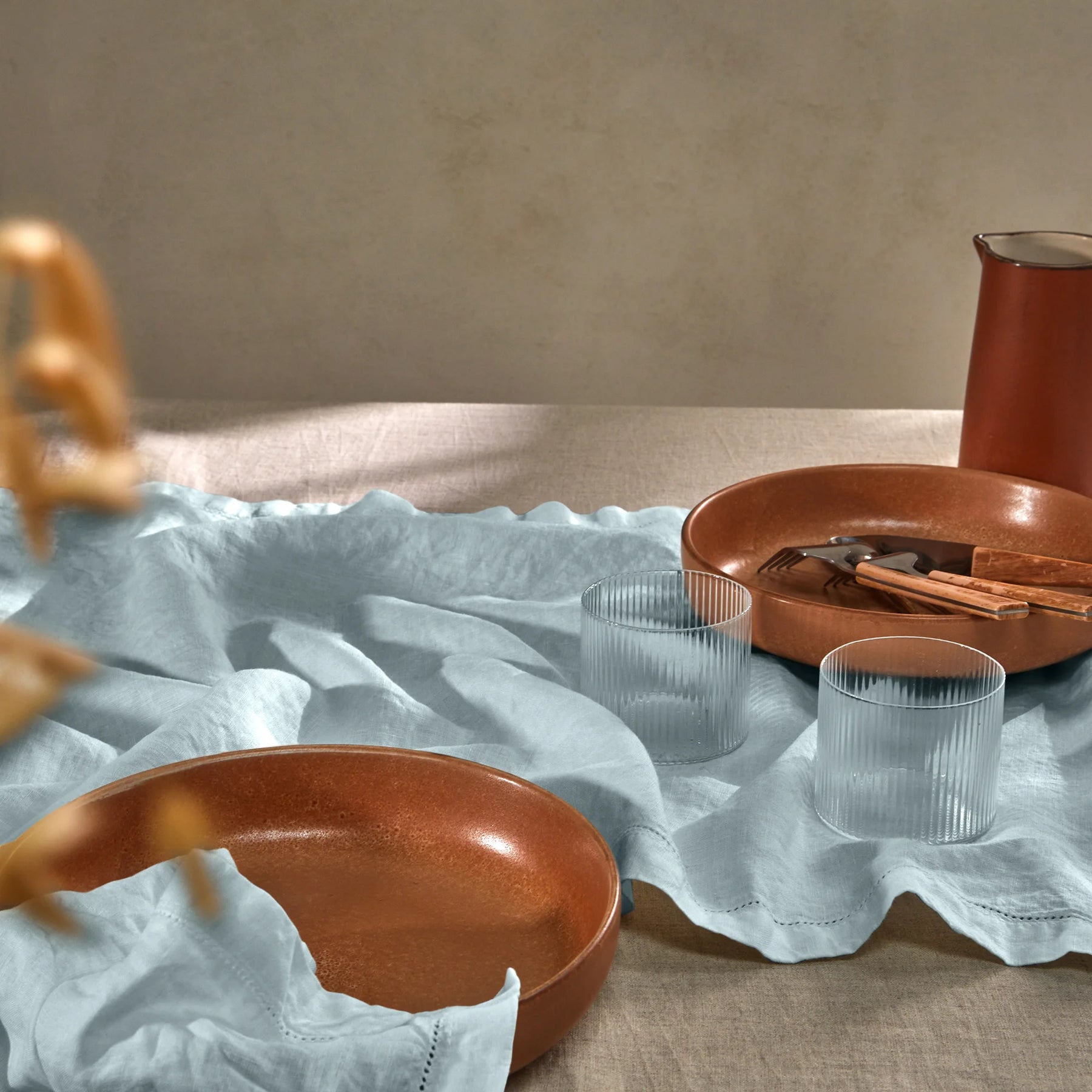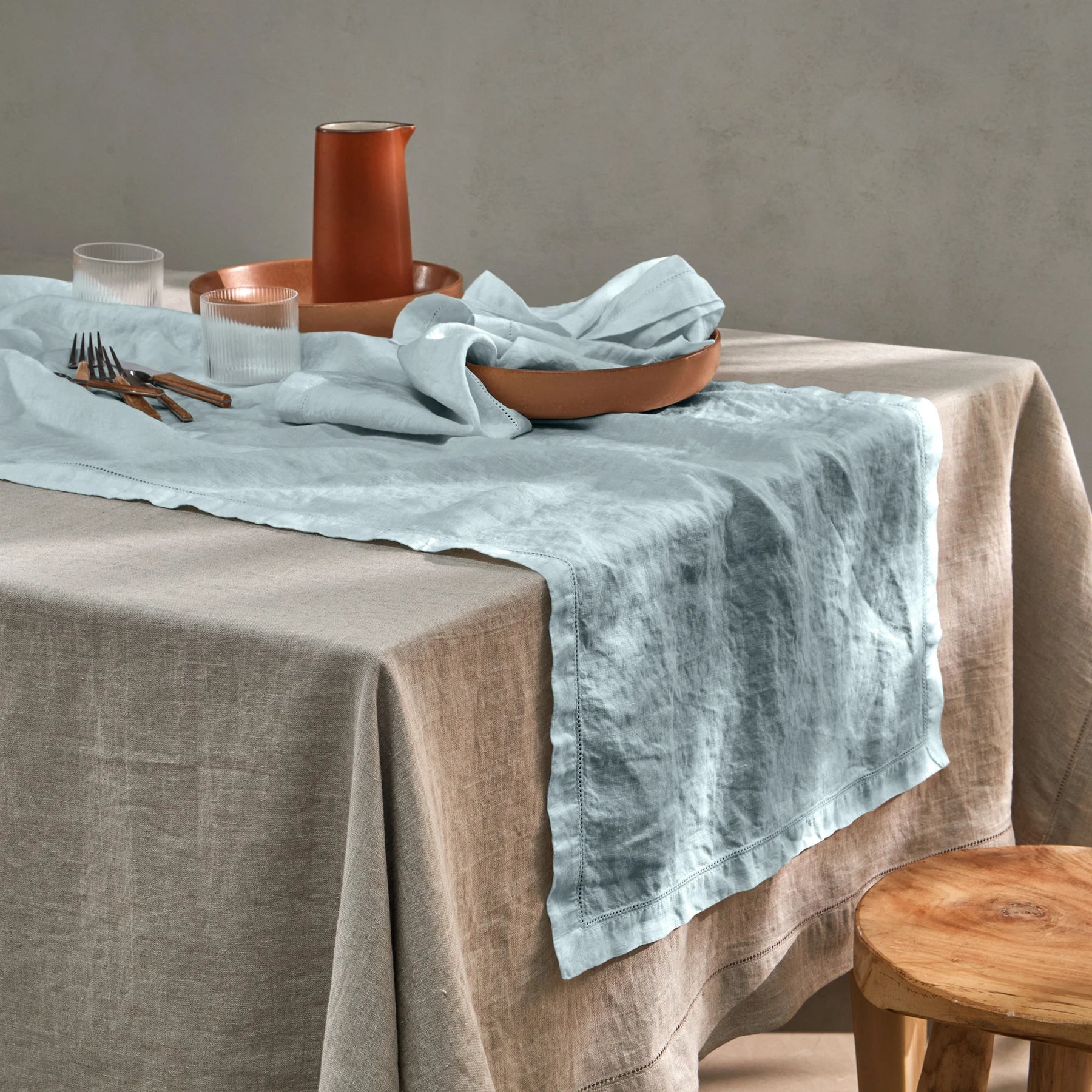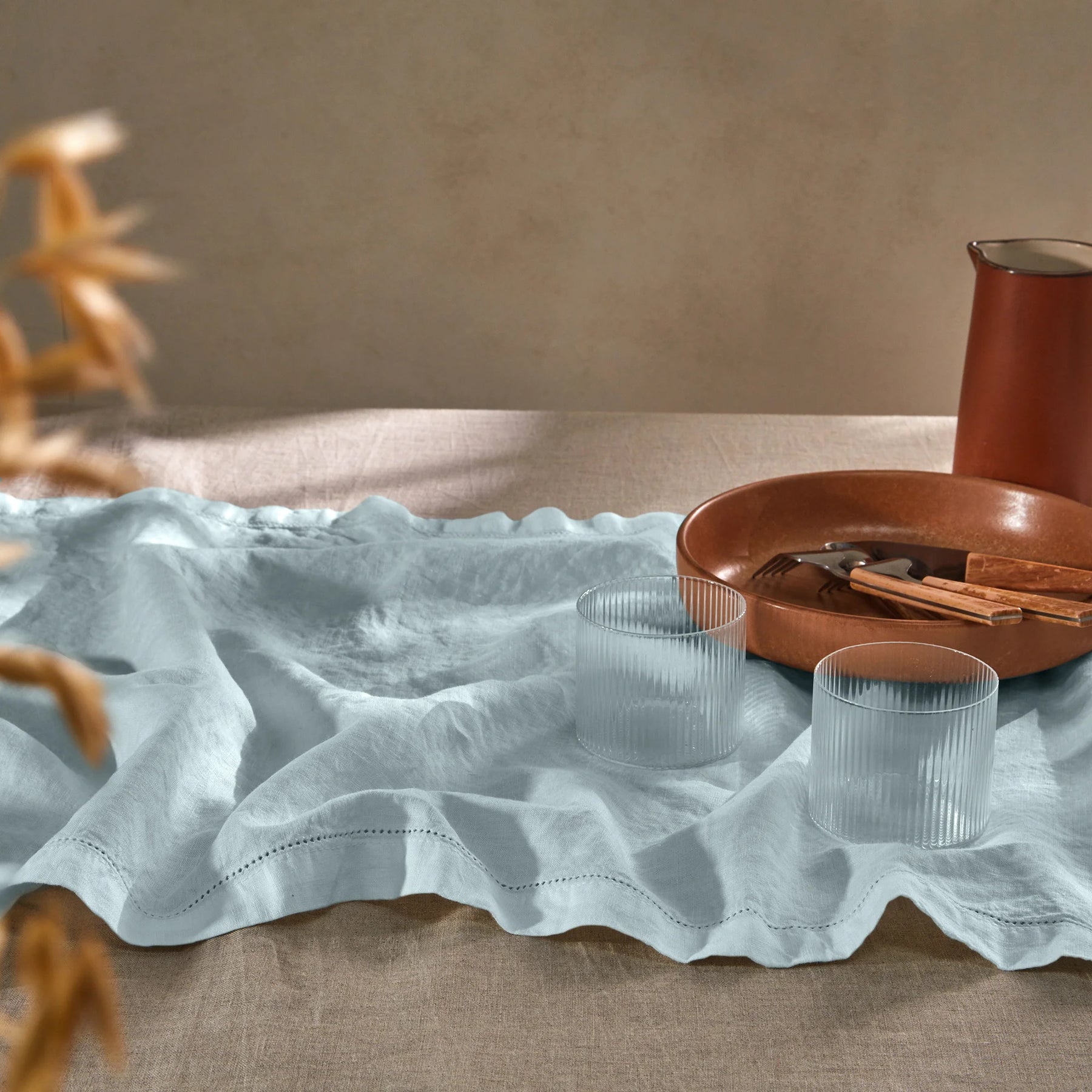 Camino de mesa de lino lavado azul glaciar con bordes calados