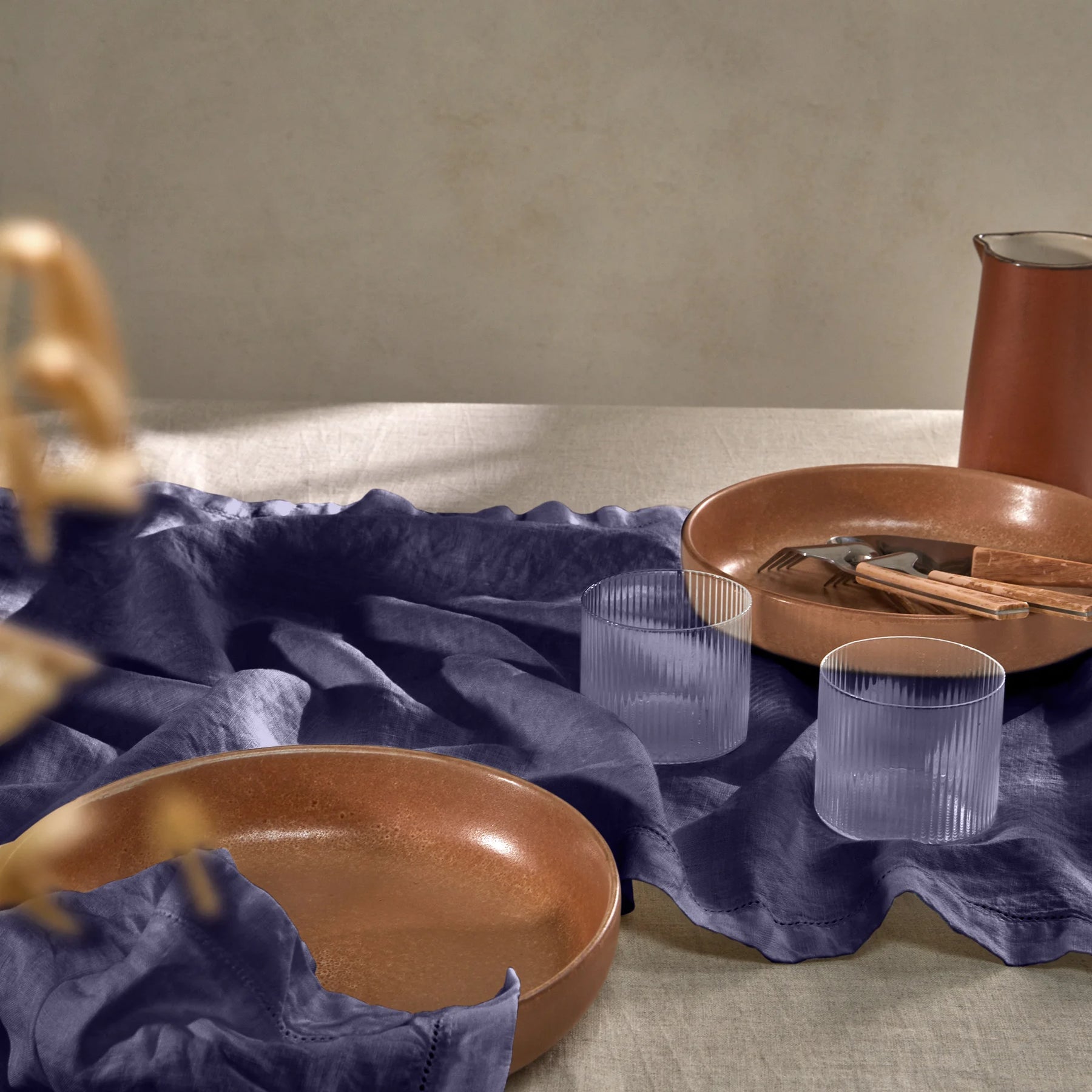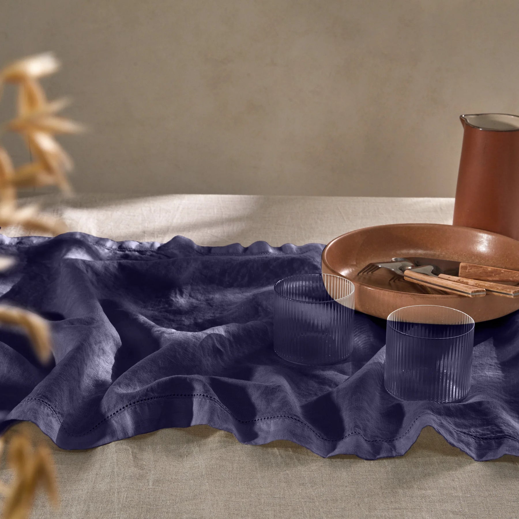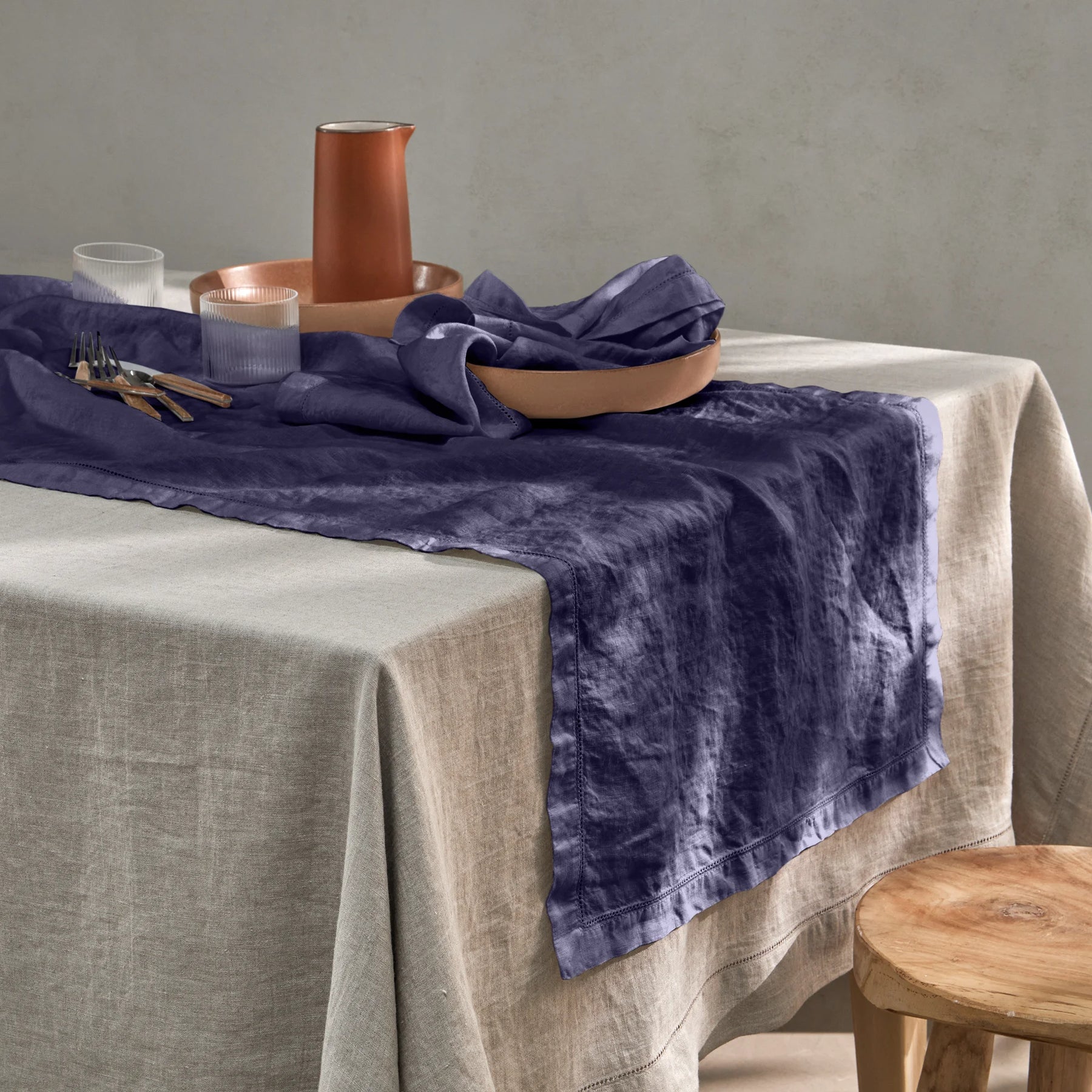 Camino de mesa de lino lavado azul noche con bordes calados