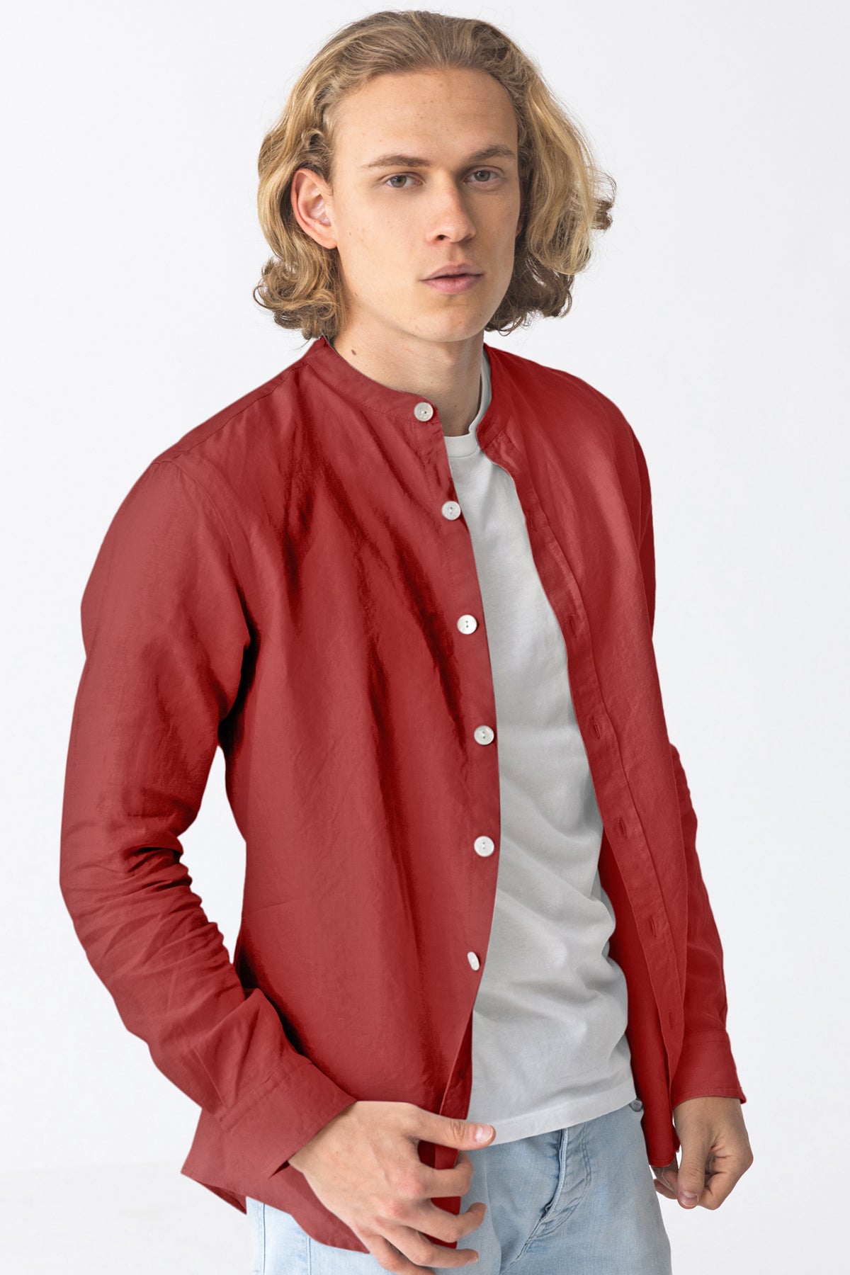 Camisa de lino con cuello mao color ladrillo rojo - Natanael