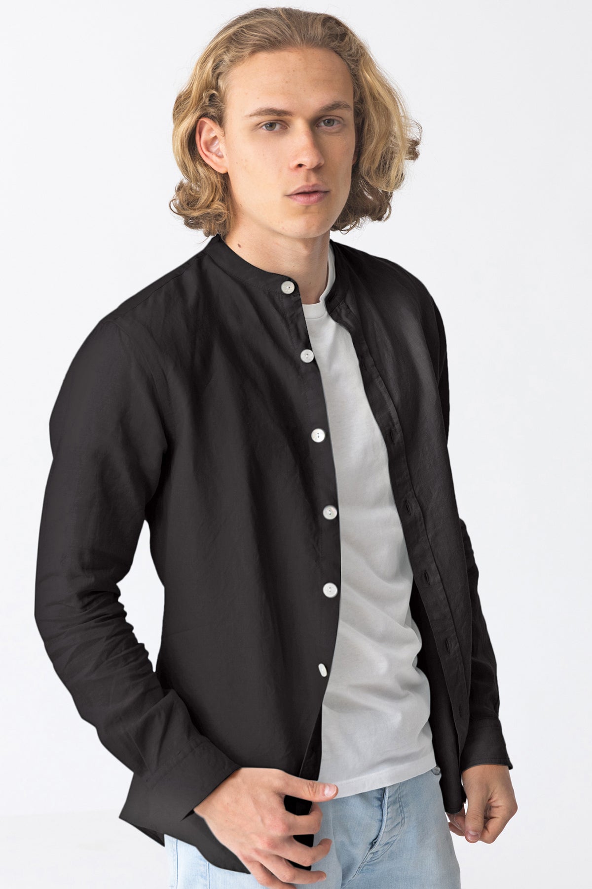 Camisa de lino con cuello mao tinta negra - Natanael