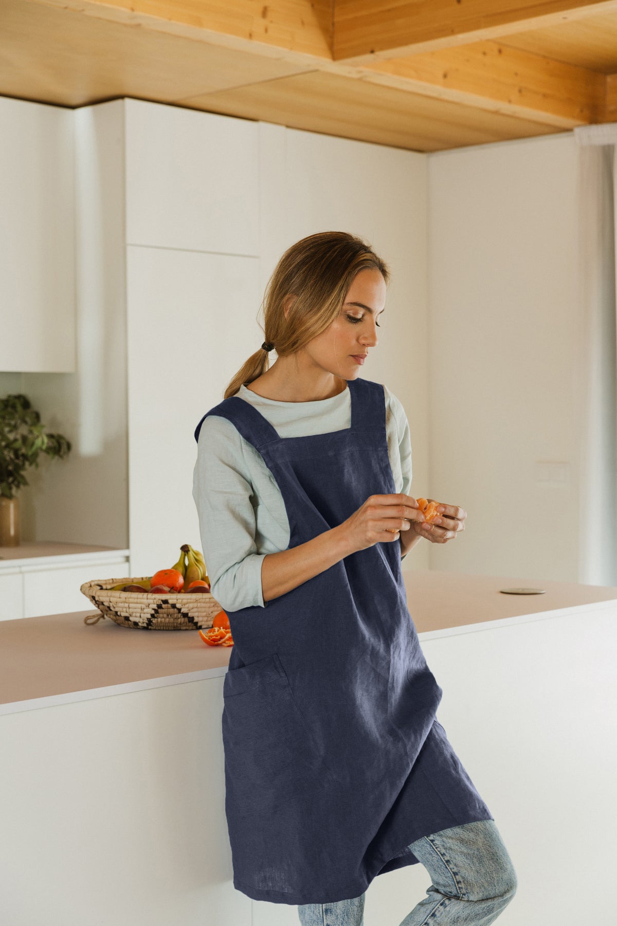 Estilo y confort a diario. Nuestro delantal japonés Noa en lino lavado azul noche presenta un corte cruzado en la espalda sin lazada: fácil de poner y muy cómodo. Tejido en puro lino transpirable, ofrece tacto natural y buena caída para la cocina, el jardín o el taller. Dos bolsillos grandes y prácticos. Fácil cuidado, lavable a máquina; el lino gana suavidad lavado tras lavado. Unisex, talla única (corte amplio) con acabados cuidados. Un básico elegante y duradero para proteger tus prendas a diario.