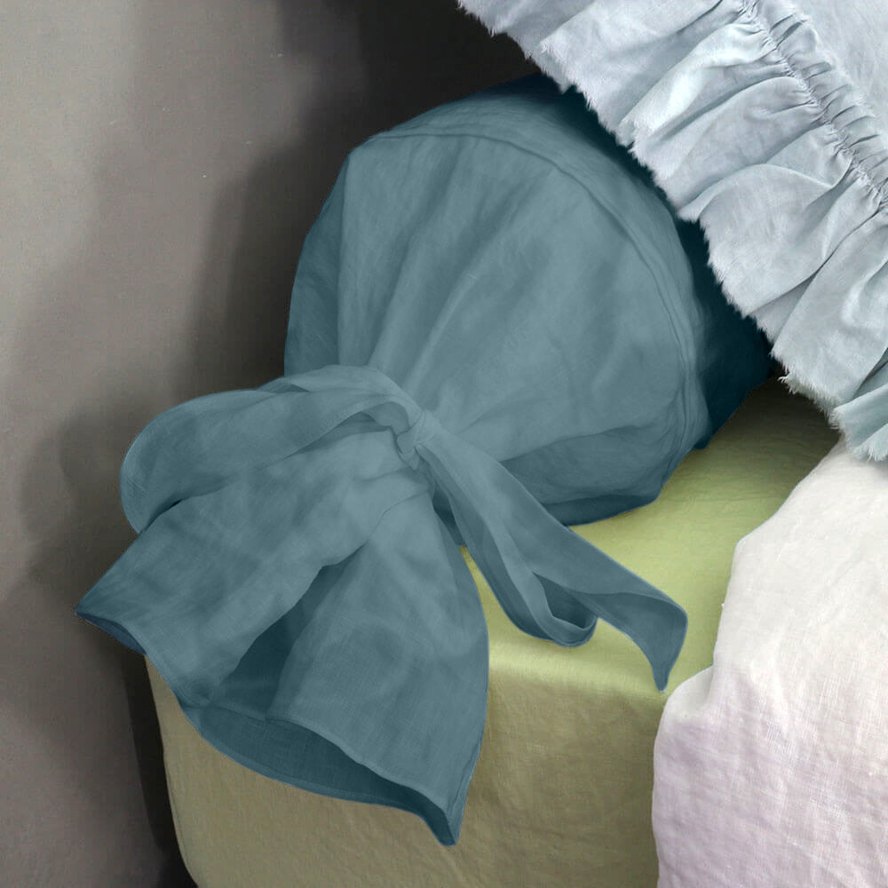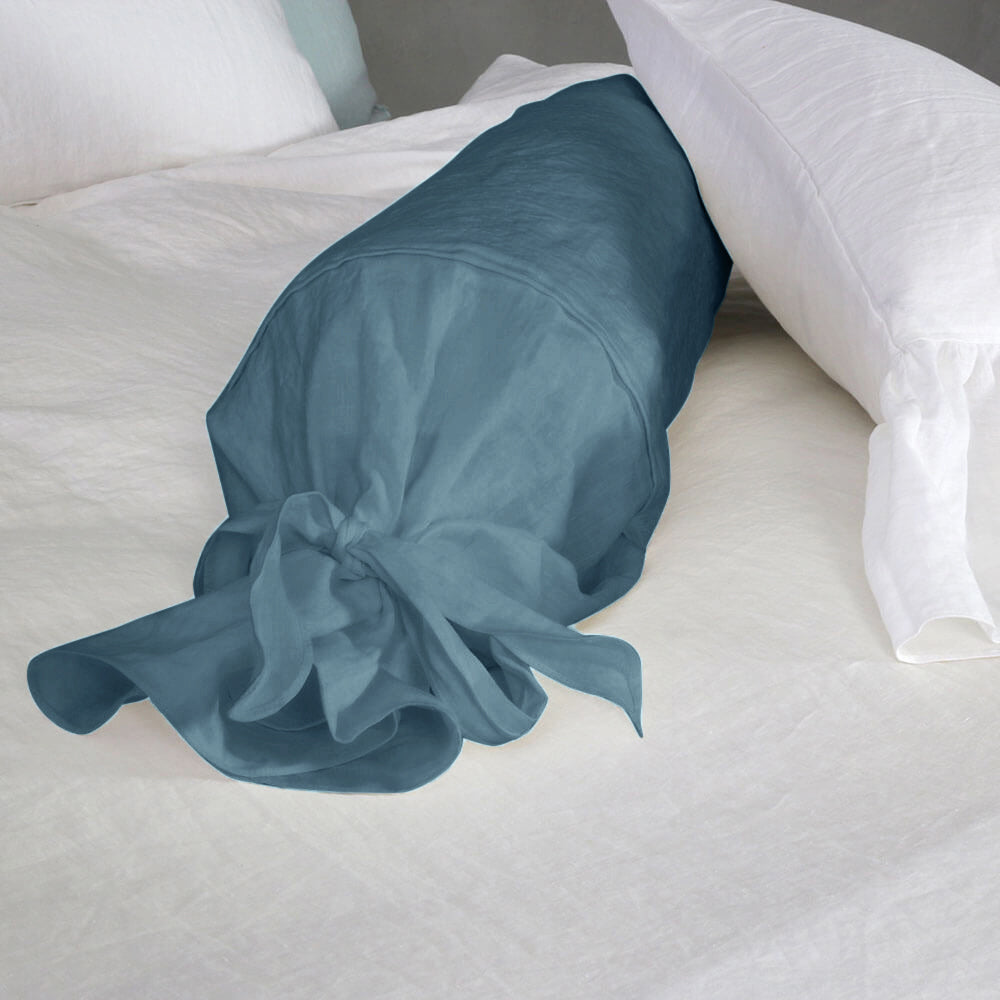 Funda de cojín cilíndrico de lino azul francés