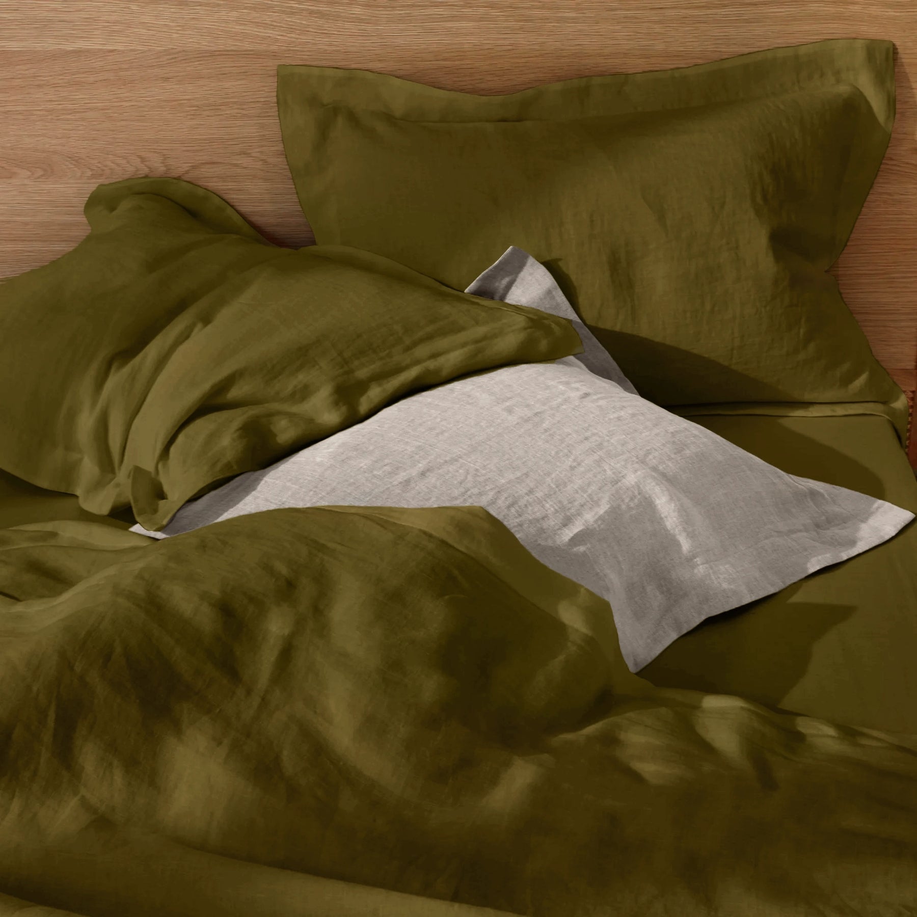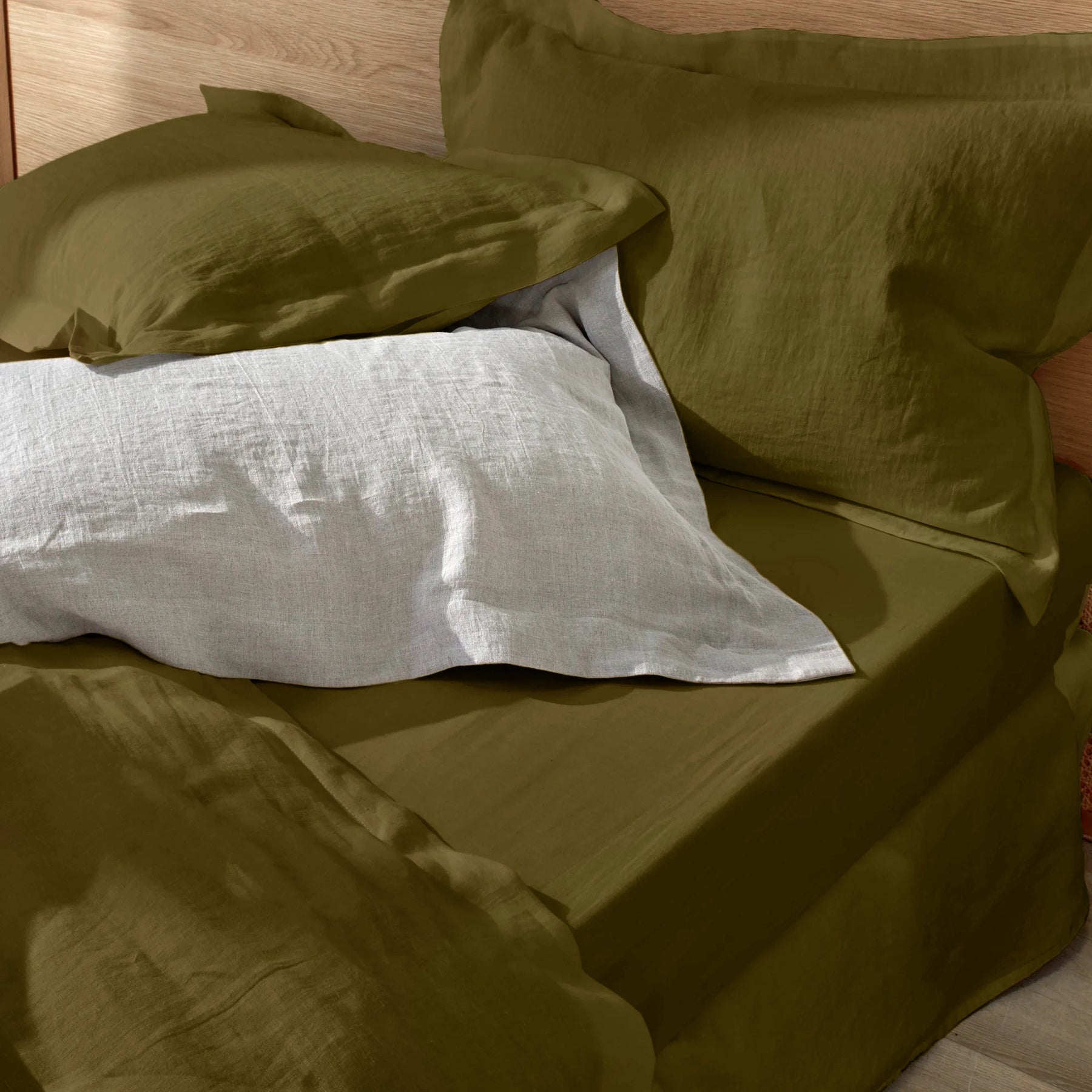 Fundas de almohada de lino con volantes planos (juego de 2) verde oliva